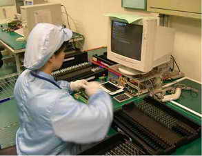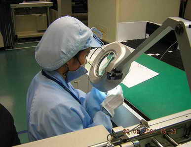 X光检测后就要对整个内存PCB进行全面细致的外观检测,这个过程是工人在放大镜下以目测方式进行的。