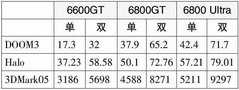 NVIDIA公布了一些NVIDIA SLI平台的测试结果,包括6600 GT, 6800 GT和6800 Ultra三款显卡在SLI状态下在3DMark05、Doom 3和Halo中的测试成绩。