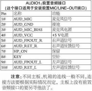 注意:不同主板、机箱的连线一般不同,连接方法要根据实际情况而定,主板上没有前置音频接口的要另寻他法了。