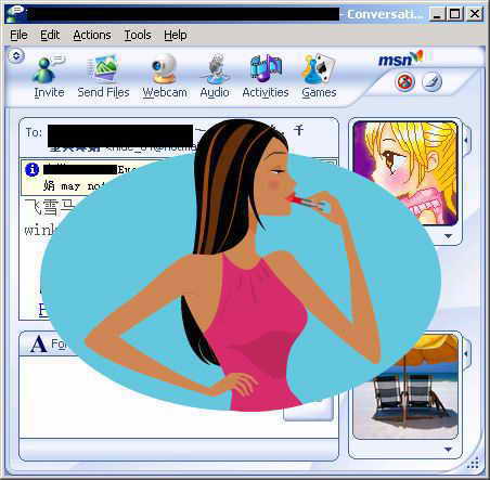 新版中更加强调个性,主面板左上方可以显示头像,好友上线提示也会出现头像。值得称赞的聊天时可以通过发送7.0新增的动画(Wink)里的有趣动画给朋友,这时朋友的电脑屏幕上就会跳出一个卡通形象摆出各种搞怪状Pose(如图)。另外,MSN Messenger7.0可以使用动态GIF文件作为自定义表情符,聊起天来就更有意思了。