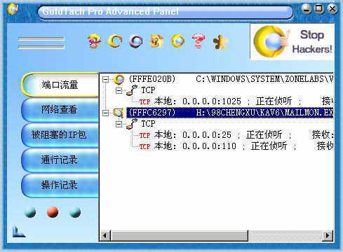 程序的界面是一个非常漂亮的金指环,单击右边的大拇指切换到常规界面。这里除了可以像一般防火墙那样查看到端口的流量、本机和远端的IP地址、通行记录等网络状态以外,还可以查看到封包的大小以及被拦截的IP包等详细情况(图1)。下面笔者介绍一下这款防火墙的特色功能。