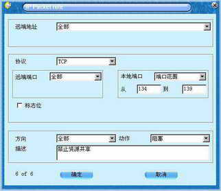 在“IP封包”标签中可以设置IP规则,来阻止有害的数据包从特定的端口流入和流出。比如不允许别人访问本机的共享资源(如共享文件夹、网络打印机等),可以按照图2所示设置IP规则,封闭TCP134~TCP139端口。被拦截数据包的详细情况可以在“被阻塞的IP包”窗口中查看。