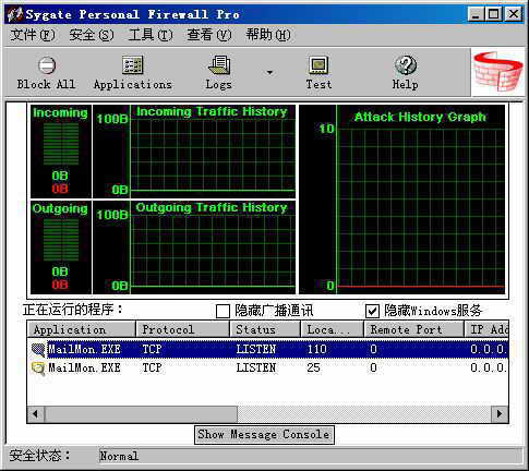 Sygate Personal Firewall 是一款简单易用的个人防火墙。安装后运行,可以在界面上看到不断滚动的、以曲线图方式显示的实时网络状态。