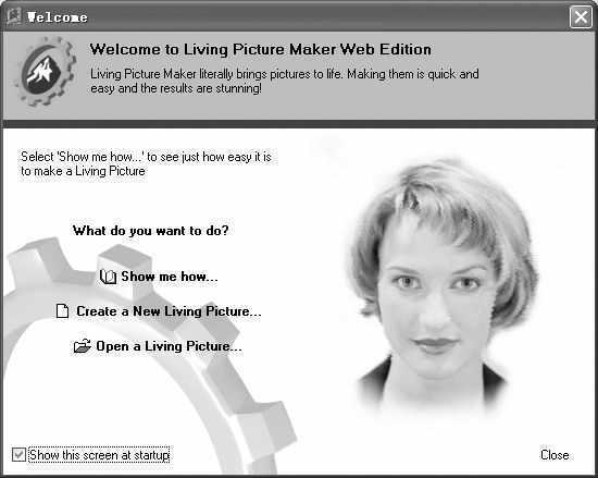 第一步:导入照片。启动LPM程序,未注册用户在出现的界面中单击“Try now”按钮进入程序主界面。随后程序弹出一个“欢迎向导”(图1),单击其中的“Create a new living Picture…”(创建一个新的生活图片)按钮,弹出一个选择图片窗口,在此选择准备好的图片,单击“打开”按钮即可将该图片导入到LPM主界面中。