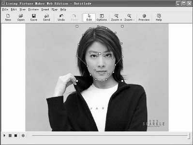第三步:调整五官。用鼠标将眼部轮廓方块移动到照片中人物的眼部位置,如果两眼间距离太大,我们可以通过正方形上的两个矩点进行调整。随后再将嘴部轮廓方块移动到人物的嘴部。在嘴部方块中间有一条绿线,这是嘴张开时的分界线。应该将嘴部轮廓中的绿线放到人物嘴的水平中间部位。经过以上设置后单击“preview”(预览)按钮就可以看到图片中人物的嘴、眼睛、脸颊部分可以运动了。怎么样?照片上的人物变活了。
