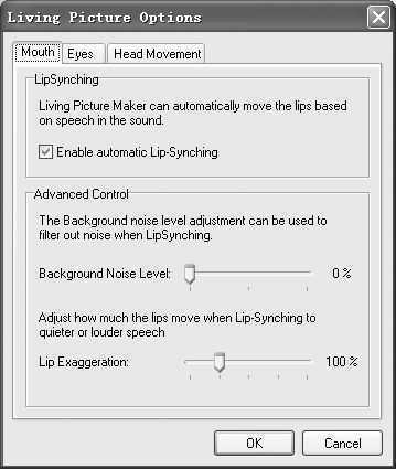 预览后我们如果感觉图片中的表情动作和音乐不太一致,这时可以对图片中的表情进行相应的调整。如果感觉嘴或眼睛的动作不太自然,在此我们可以单击“Options”(设置)按钮,打开设置对话框(图4),该对话框分为:Mouth(嘴)、Eyes(眼睛)、Head Movement(头运动)三个选项,其中,在“Mouth”项中勾选下面的“Enable automatic lip-synching”复选框,这样可以让嘴唇的移动与录制的声音同步。如果要对嘴唇进行精确的控制,可以通过下面的“Background Noise Levet”(背景声音设置)和“Lip exaggeration”(嘴唇的扩展)进行控制。在“Eyes”项中我们可以对眨眼的频率和眼皮张合的程度进行设定。在“Head Movement”项中我们可以对头移动的方式和旋转的程度进行设置,当然我们还要根据声音强烈程度进行设置。