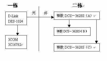 整个网络包括一栋、二栋两栋楼,采用了网络综合布线。一栋采用了一台D-link24口交换机和一台3COM 16口交换机级联;二栋采用三台神州数码24口交换机级联。两栋楼之间通过一个100Base-FX光纤模块连起来的。