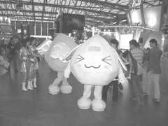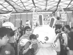 会场里还有RO的天使波利、《希望Online》的哈比兔、《神之领域》的帕吉等扮演者在人群中走来走去,供大家拍照。据说《希望Online》的哈比兔那身行头,有30kg重。想想穿戴着密不透风的30kg行头,在闹闹嚷嚷的会场移动一天,还要不断摆POSE让他人拍照,甚至上台表演……这工作可真够呛。估计一天下来,人都要虚脱。