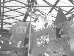 可惜会场几天来都是人山人海,而展台上那些美女MM又永远被“狼”性观众的DC和DV重重包围。左肩背DV、右臂挂DC、细胳膊细腿兼行动迟缓的小兔明显无法与人潮抗衡,逆流而上。因此大部分时间里,小兔都只能很郁闷地将镜头对着没有人的展会顶棚。不过倒也拍了不少“梁上风光”,比如网星的无敌飞天小猪猪。