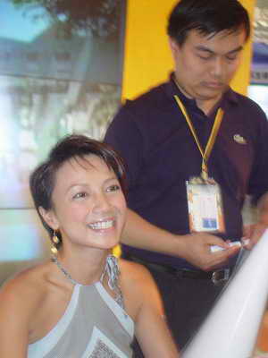 10月5日下午,朋友sleepboy叫灼灼去联梦在线展台看港姐。灼灼蹦过去之后港姐的签名活动还没开始,只见到联梦的二层展台上站着一个衣着华丽的女子,啊,她不就是1995年的香港小姐杨婉仪吗(小生:你居然连1995年港姐是谁都记得这么清楚呀?我连今年的都不知道!)。不过这时候大部分在联梦展台簇拥的玩家都还在争抢周杰伦签名全球限量销售CD和刘德华演唱会门票。等到下午3点30分,杨婉仪小姐开始签名时,则引起了更大的骚动。