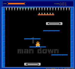 这是一个用键盘控制的游戏,主要用左右方向键,在连续上升的参差不齐的跳板上左右穿梭,不能踏空,踩钉板、撞钉壁扣血,在如此苛刻的条件下,你能下到100层吗?