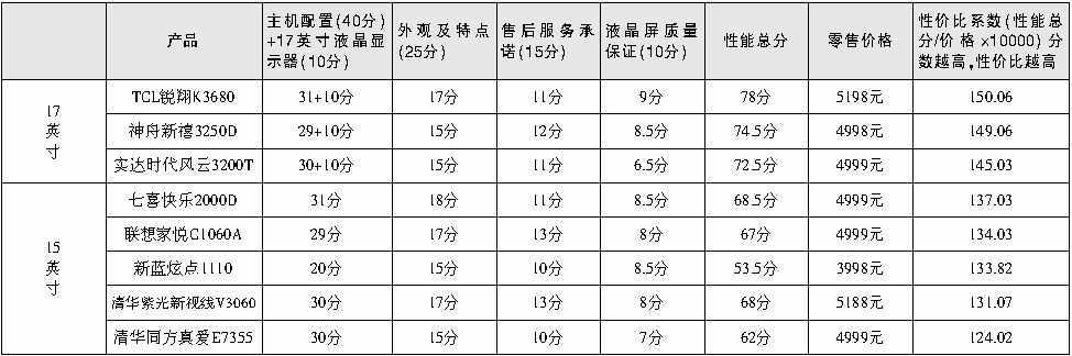 由于在5000元这个价位上,分别有采用15英寸和17英寸液晶屏的机型,因此小顾决定把这两个尽寸的机型放到一起进行横向比较。先给各个配置打出性能分数,最后再总结到一起,根据各台电脑的价格算出它们各自的性价比。这样,就可以在同价位的产品中,找到最具性价比的产品啦^_^