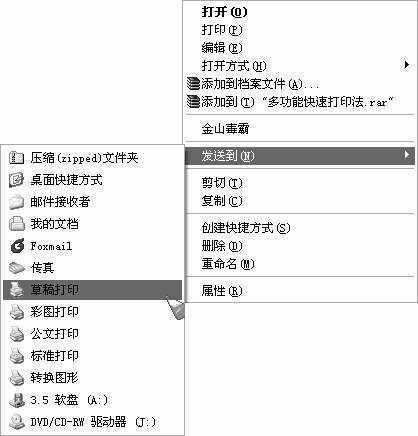 打开资源管理器(或我的电脑),选中一个或多个要打印的文件,右击选择“发送到→草稿打印”即可以草稿质量打印文件。其间可能会有一个print to的确认窗口,请单击“确定”继续。同样,发送到其他打印方式即可进行相应质量设置或打印机的打印(如图2)。