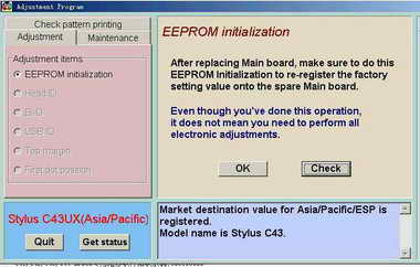 连上你的EPSON C41打印机后,选择Adjustment→EEPROM initialization(EEPROM初始化),按“OK”确定完成初始化(图2),然后你就可以选择旁边的Check,看到显示的是C43,这样打印机就成了EPSON C43了。