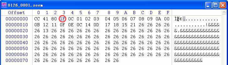 第二步:打开P2kman,等右侧的进度条完成后,在图1所示的上端Seem位置,添加“0126”和“0001”,然后点击“下载Seem”,弹出保存文件对话框,找一个位置保存,命名为0126-0001.seem。然后用十六进制编辑器打开这个文件,数据部分如图2所示,把图2中圈内的“1F”改成“7F”,保存文件。