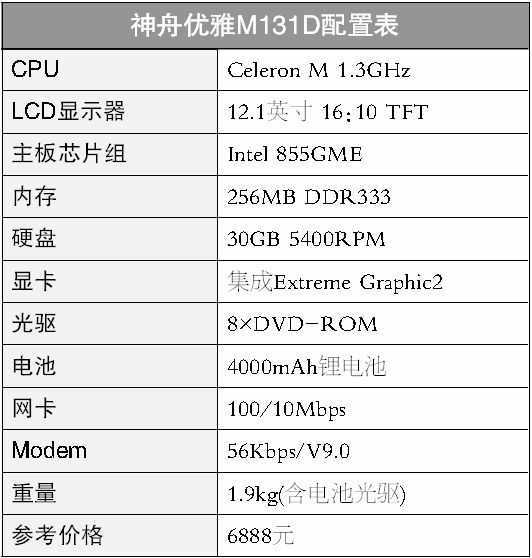 6888元即可购买一款内置光驱的12英寸宽屏笔记本电脑,神舟优雅M131D的价格是相当有杀伤力的!用相对便宜的价格,购买一款时下正流行的宽屏笔记本电脑,对于追新的时尚人群来说,无疑是不错的选择。