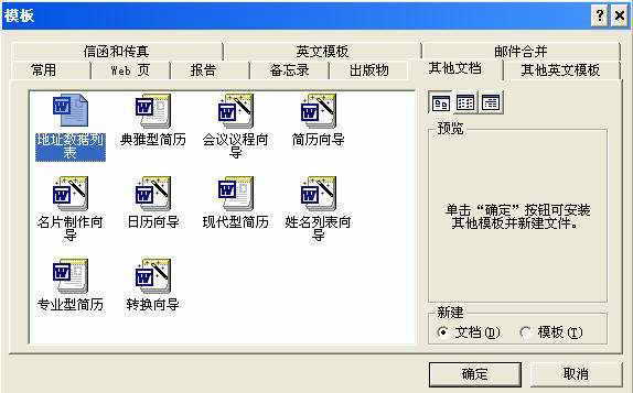这种简历最简单的制作方法就是利用Word(以Word 2003为例)中自带的模板功能来制作,只要几步操作,就可以轻松帮你制作出一份标准的简历。在新建文档的时候,选择本机模板,然后选择其他文档,就可以使用各种现成的简历模板了(图1)。有典雅型简历、现代型简历,还有专业型简历等。还可以使用Word自带的模板向导,按照提示操作便可制作出符合客户需求的通用简历来(关于用Word制作简历的详细操作见E12版文章)。