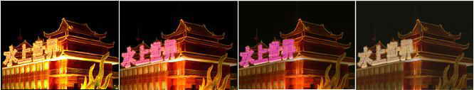 启动Fireworks MX后首先打开前面制作好的变幻光照GIF动画,然后按下“Ctrl+R”快捷键导入霓虹灯文字动画,把它拖到水上酒楼上的合适位置,预览一下看看,是不是一张静态的照片变成了流光溢彩的动画了?