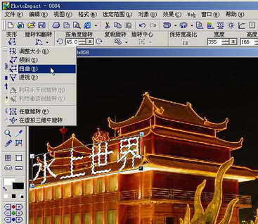 打开我们拍摄的照片,使用文字工具输入“水上世界”文字,然后激活工具栏上的“变形”工具,打开变形下拉菜单选项,选择“扭曲”命令。使用鼠标点住文字四周出现的节点并拖拉,参照背景照片的情况将文字的大小及视角全部调整好后,使用移动工具将它放置在水上酒楼的屋檐上(图2)。