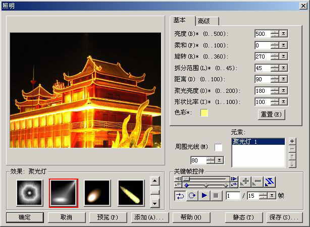 重新导入刚才的照片,按下“Ctrl+A”组合键全选后打开百宝箱,再打开“动画画廊→动画照明→聚光灯2”模板,使用“元素”栏的“-”号按钮删除灯光2和灯光3,也将动画帧数设置为15帧(与前面霓虹灯帧数同步),同样设置第0、8和15帧为关键帧,在“色彩”选项中分别将三个关键帧的灯光颜色设为蓝、红、白三色(图4)。