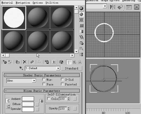 1.前期工作准备:我们首先在场景中制作出来一个Torus(圆环),并赋予它一个简单的材质:Diffuse(漫反射)的颜色设置为RGB(210、255、255),Specular(镜面反射)的颜色设置为RGB(255、255、255),并调整自发光颜色为100。这里要注意一下:还要在材质编辑器的工具栏中将Material EFfects Channel(材质效果通道)设置为1(如图1),大家在后面的操作中可以体会到这一步操作的重要性。