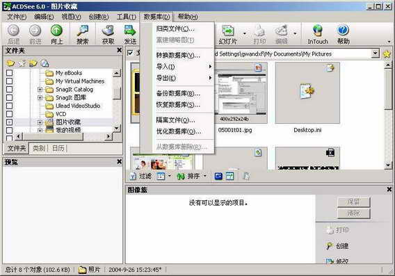 点击ACDSee主界面菜单“数据库→备份数据库”选项(如图),便可进入“ACD数据库向导”对话框,利用该向导,可以很方便地对ACDSee进行数据库的备份。