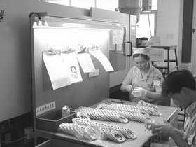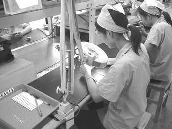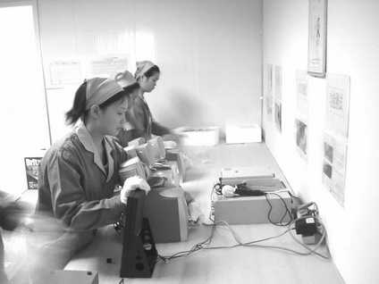 接下来看看音箱的核心部件──电路板(PCB)的生产工序。这道工序包括两条链式插件生产线、四台波峰焊机,完成电路板插件安装、波峰焊接、补焊及焊点检测等工作。