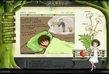 虫虫很早以前就知道“苹果树下”(http://www.appleshow.cn)这个个人主页了,网站设计相当漂亮和富有个性。站长是个名叫苹果的可爱女孩,有超强的绘画功底。站内有许多她的原创作品:自画像、心情日记、手绘、摄影、网页、动画、贺卡……真可谓样样精通,让人不由自主心生欣赏和羡慕之情。:)