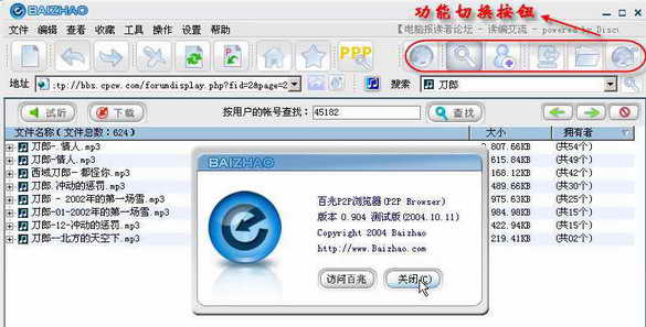 现在我们来利用P2P进行文件下载,可惜的是它仅提供音频文件的下载。但它采用多源下载技术和独特的穿透防火墙能力,使得内外网用户都可随意下载并且支持多任务同时下载。方法是:在右上角的“搜索栏”内输入你想要的歌曲的名字或歌手名称,然后回车即可打开搜索结果页面。值得一提的是:百兆拥有国内所有P2P软件不能实现的P2P在线音乐试听功能,双击即可开始听音乐(需要安装RealPlayer),并可选择边听边下载,从此你不再为硬盘音乐太多装不下而烦恼了(图2)。