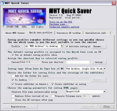 首先到http://www.sky cn.com/soft/16119.html下载大小仅为617KB的MHT Quick Saver插件,安装到系统后从程序组中启动MHT Quick Saver的设置窗口(图1)。在设置窗口中选择“Quick save profiles”选项卡。默认有好几种设置方案,每种设置方案都对应着相应的设置参数(例如默认保存的网页文件的位置、类型等),如果你不想使用默认的设置方案,你可以自行建立一个设置方案。