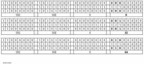 整个局域网的网络ID“192.168.0.0”的最后一位是“0”,二进制表示为“00000000”;而已经计算出的子网掩码“255.255.255.224”的最后一位是“224”,二进制表示为“11100000”。由于整个局域网的网络ID和计算出的子网掩码的最后一位的后五个数字都为0,因此二者只有前三位和最后一位的前三个数字参加“与运算”,并且网络ID应该依次递增(图2)。