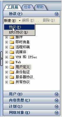 在ISA 2004管理控制台窗口中,选择进入右侧框体的“工具箱”标签页(图1),点击“协议”分栏,接着点击“新建→协议”,弹出“新建协议向导”对话框,在名称栏中输入“UDP-8000”。点击“下一步”按钮后,在“首要连接信息”对话框中点击“新建”按钮,弹出“新建/编辑协议连接”对话框,在“协议类型”中选择“UDP”,将“方向”设为“发送”,端口范围设置为“从8000到8000”,然后点击“确定”按钮,接着一路点击“下一步”按钮完成UDP-8000协议的建立。