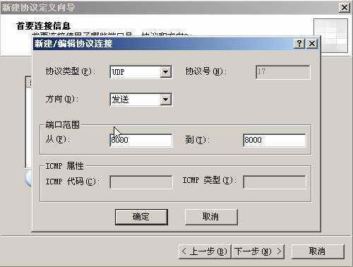 在“新建协议向导”的名称栏中输入“TCP-80”,接着在“首要连接信息”对话框中点击“新建”,弹出“新建/编辑协议连接”对话框。在“协议类型”中选择“TCP”,将“方向”设为“出站”,端口范围设置为“从80到80”,点击“确定”按钮后,一路点击 “下一步”按钮即可完成TCP-80协议的新建。