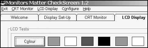 如果条件允许,大家也可以去网上下载Monitors Matter CheckScreen,这是一个仅几百KB的显示器测试软件。它带有专门的LCD显示器测试项目,其中的“Colour”项便是这种全屏幕的黑、白及彩色效果。