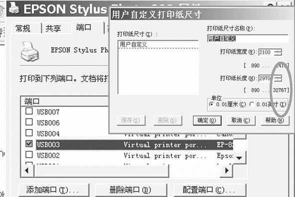 打印纸张最大长度设定技巧:所有EPSON的喷墨打印机在打印纸张长度上都支持111.76厘米,但是有卷纸打印功能的打印机,比如890、900打印机,则可以支持最大的纸张长度为327.67厘米。如果你的打印机是830或者R210,那么支持最大的纸张长度只有111.76厘米,要打印超过这个长度的图,就得将你的打印机选定为890或者900打印机,这样也就可以打印出最大为327.67厘米的长图了。其具体做法如下:在EPSON的官方网站去下载890或者900打印机的驱动进行安装,安装后将连接电脑的端口调整为与你现在的打印机端口一致,比如你的830打印机端口是USB3,那么900打印机的驱动端口也要调整为是USB3(图9),这样在打印中就可以选用900的打印机了。