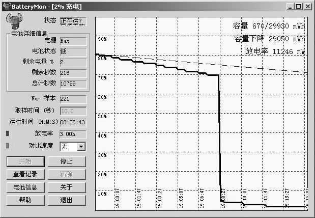虽然BatteryMon可以不通过对电池的完全放电来预测电池放电曲线和性能状态,但由于电池性能的不稳定性和难预测性,在用BatteryMon测试电池时,在时间允许的情况下尽量多测试一些时间。对于二手电池来说,放电中途的电量突变现象是较为常见的,但一般不表现在放电初期,因而如果测试时间较短是不容易发现电池的不良特性的。图3是某性能不良电池的放电曲线,其电量从100%~70%是比较平稳的,但过了70%就突然降为10%以下,说明该电池的特性已变坏,其内部的电芯有一组或两组已衰老变质,这样的电池是不推荐购买的。