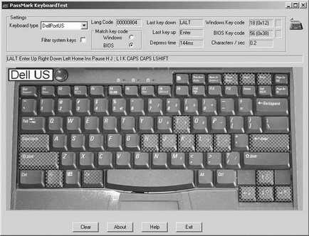 键盘是最基本的输入设备,在使用笔记本电脑的过程中,我们几乎天天要与键盘打交道,键盘的重要由此可见一斑。接下去要为大家介绍的是一款笔记本键盘测试软件──PassMark出品的KeyBoard Test。KeyBoard Test是一个可以试用30天的共享软件,它可以在较短的时间内帮助用户检测笔记本键盘上每个键的好坏。KeyBoard Test的功能较为单一,界面也很简洁。对话界面分为上下两部分,上部为几个简单的设置及测试时显示的一些参数,如每个键按压时持续的时间、最后按压的键名称等;下部为与实际笔记本键盘相对应的键盘图(图4)。