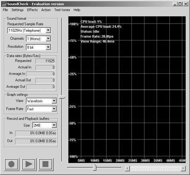 SoundCheck还可以对本本内置话筒和喇叭进行录音和回放的质量效果检测。在软件主界面的左下角,有三个按钮,分别是“录音”、“播放”和“停止”按钮。点击“录音”按钮,即可对着本本内置话筒说话进行录音,按“停止”按钮停止录音后,就可通过“播放”按钮来播放已录制的声音。测试时,用本本话筒录音后,把本本音量开到最大,在播放声时仔细聆听除了语音之外是否存在其他干扰声或电路噪声,一些笔记本电脑的音频电路的屏蔽做得不够好,或者是线路处理不怎么合理,在测试时就可以很明显地听到不正常的电路噪声。