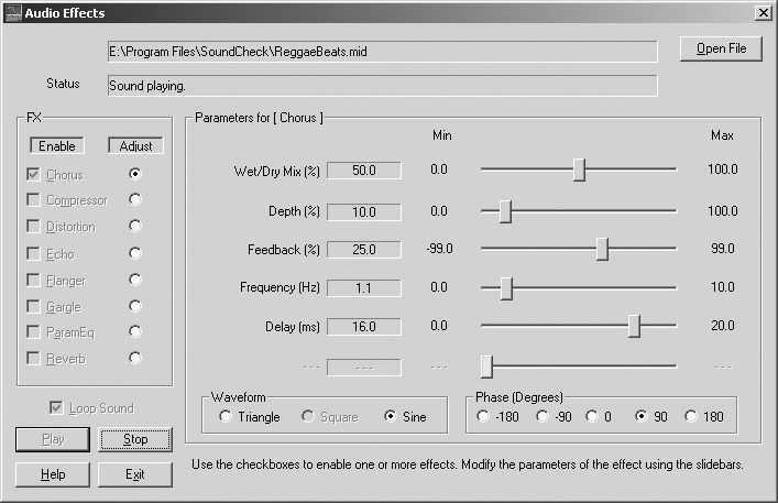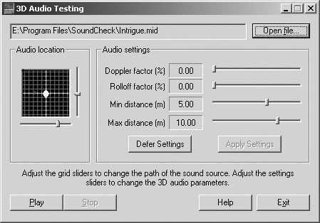 3D Sound和Audio FX的效果测试选项均在“Effects”菜单下面,单击“Effects”中的“3D Sound”后会弹出相应的测试界面(图7),按“Play”后测试开始,软件将输出一段方位感很强的立体声音频信号,页面中还显示了一个音频信号位置的模拟图(Audio location),当中代表音频信号的红色十字图标在黄色的人头周围不停地转动,非常直观。页面右边的“Audio settings”可以对测试进行一些参数设置。实际测试时,如果本本喇叭播放的音频信号方位感含糊不清,则说明音频电路表现不佳。Audio FX的效果测试在“Effects”中选择Audio FX即可进行,测试界面如图8。