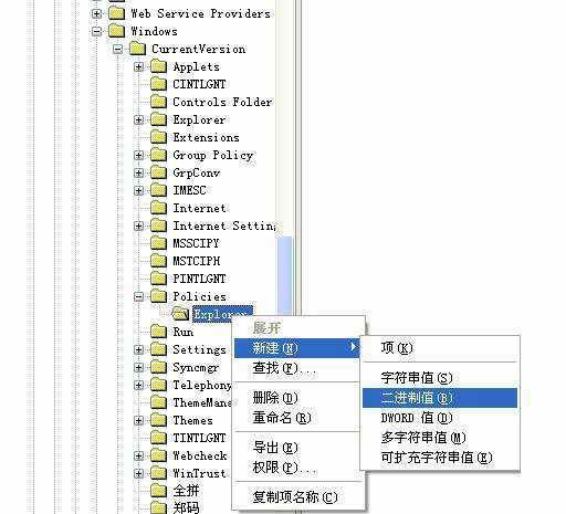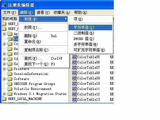 ②将鼠标指向“新建”,然后单击需要添加键值的类型,这些类型包括“字符串值”、“二进制值”和“DWORD”值,新添加的键值以一个临时键值显示,为新添加的键值输入一个新的值,然后保存退出就OK了。