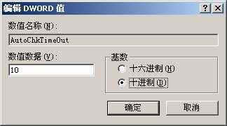 ②双击该值进入编辑对话框,在“基数”区域中将“十六进制”点选为“十进制”,根据自己的需要将“数值数据” 一栏中的数值设为适当的数据,比如输入“0”,则表示进行磁盘扫描前无等待时间,而输入“3”则表示进行磁盘扫描前的等待时间为3秒。