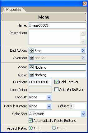 我们得到一个设计好的DVDMenu了,但是,这个DVDMenu是静态的,我们需要把它变成动态的!双击我们刚编辑过的主菜单,打开Menu编辑窗口和Menu属性窗口(图6)!