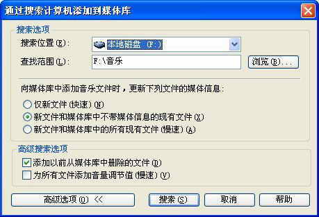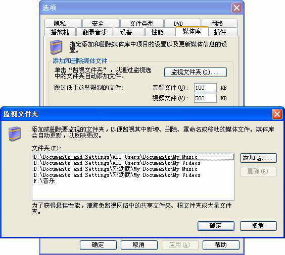 从“工具”菜单中选择“选项”命令,然后从弹出的“选项”对话框中选择“媒体库”选项卡(图3),单击“监视文件夹”按钮,在“监视文件夹”对话框中通过“添加”按钮来设定要监视的文件夹。需要提醒的就是这种自动监视文件夹的功能只有在NTFS分区才有效。