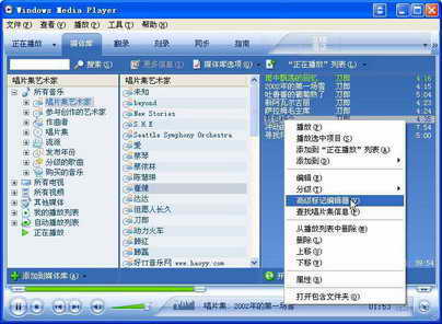 将电脑中的媒体文件加入到媒体库后,就可以从媒体库中根据作者、作品集、标题直接选择播放这些文件了。也可以通过选定歌曲来生成“正在播放”列表(图2)。