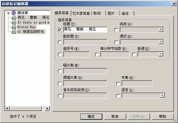 在“媒体库”窗口中选定某首歌曲,单击鼠标右键,从快捷菜单中选择“高级标记编辑器”,会弹出“高级标记编辑器”对话框,你可以在这里修改曲目信息(标题、流派等内容)、艺术家信息、歌词等内容。修改后的信息会保存在歌曲的文件头中,除了歌词信息外,其他的许多音频播放软件也可以从文件头中读取这些信息。如果一次选定多个文件,我们还可以一次性修改多首歌曲的文件信息。