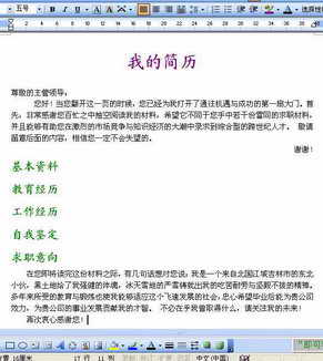 对于文中的主标题,例如“我的简历”,我们可以在格式工具栏上对其进行字体、字号以及颜色等进行设置。例如字体设置为“华文行楷”、字号设置为“一号”、颜色设置成好看的紫罗兰。