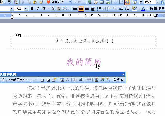 依次打开“视图→页眉和页脚”,此时将出现“页眉”编辑框和“页眉和页脚”工具条,在编辑框中我们可以输入展现自己信心的语句,在这个框中可以像在文档中编辑一样,可以设置字、字号及颜色等(图6)。