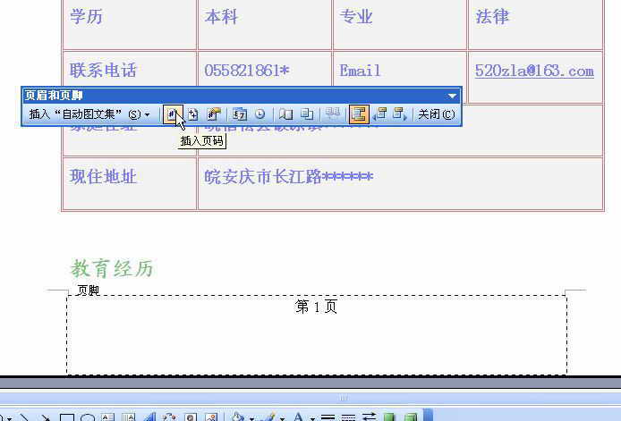 点击“页眉和页脚”工具条上的“在页眉和页脚切换”按钮,此时将切换到一页的最底部。在页脚处我们可以设置页码,这样让整个简历显得有连续性。点击工具栏上的居中按钮并输入“第页”,然后将光标指向“第”和“页”之间,接着再点击“页眉和页脚”工具条上的“插入页码”图标按钮(图7),最后点击“关闭”,这时我们将发现每一页的最底部都会有页码数。