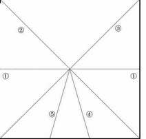 Step2 在横向标尺10处(20cm的一半宽度)画一条通长的直线①──①(如图)。用“直线”按钮在正方形纸中画两条交叉的对角线②和③。用“直线”按钮,从中心点开始,在下部画两条斜线④和⑤。