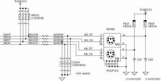2.怀疑是BIOS设置及软件问题,但检查BIOS设置没发现问题,最后重装系统,故障依旧。至此,确认故障在主板上。因为是杂牌主板,无相应资料,只能通过参考其他i810主板的PS2接口电路图(两者电路基本相同,见图)来进行检修。